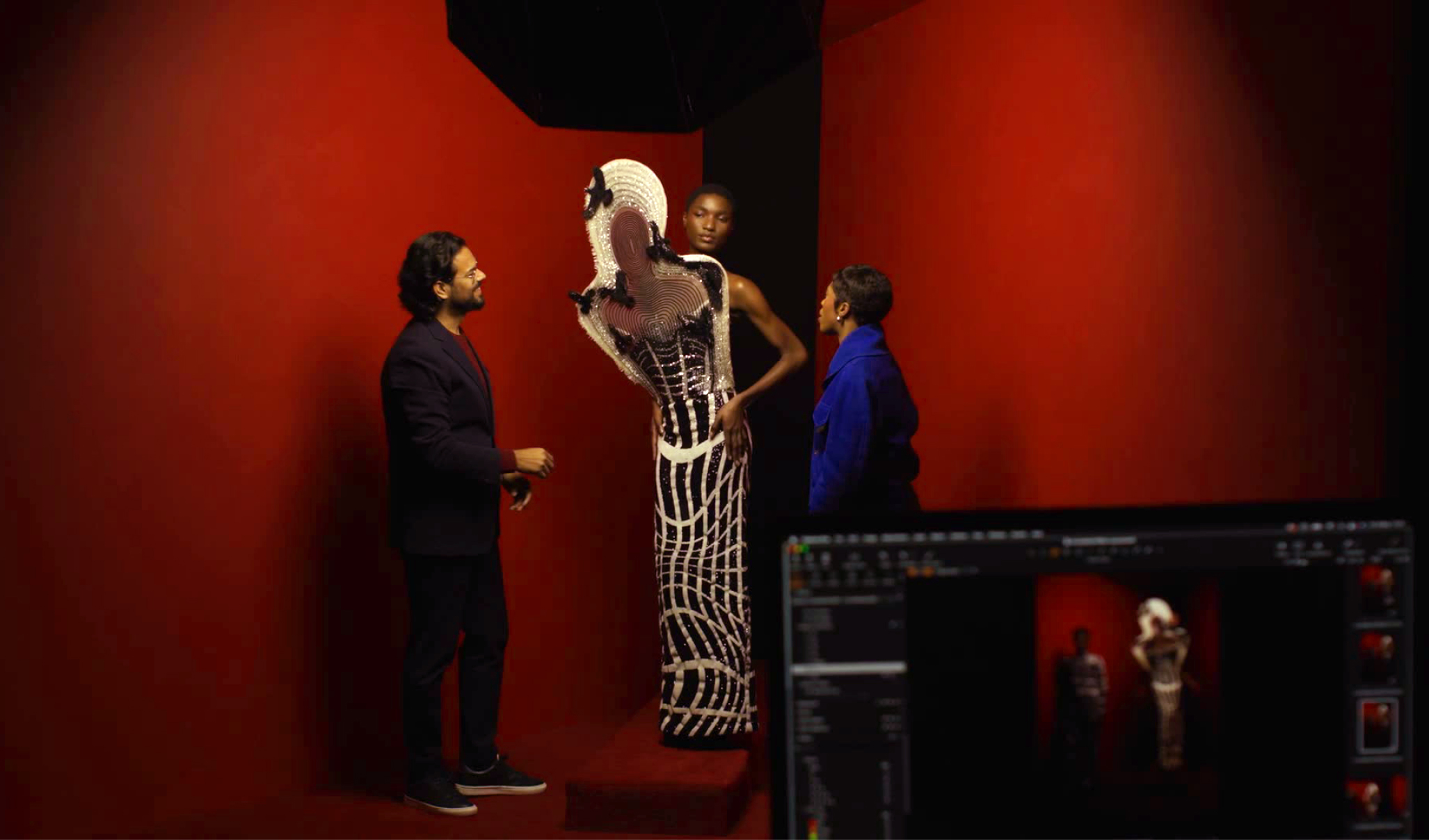 The art piece “Rhizome” explores 3D optical illusions and movement inspired by the Himalayan mountains. It harmonises the geometric forms within Bianca Saunders’ aesthetic with the organic, nature-inspired elements of Rahul Mishra’s couture work.